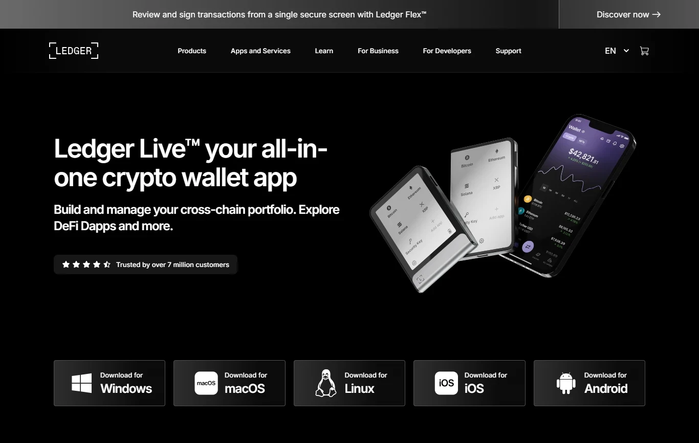 This app manages your portfolio, installs crypto apps on your device, and facilitates transactions. For mobile users, the app supports Bluetooth pairing with Nano X.